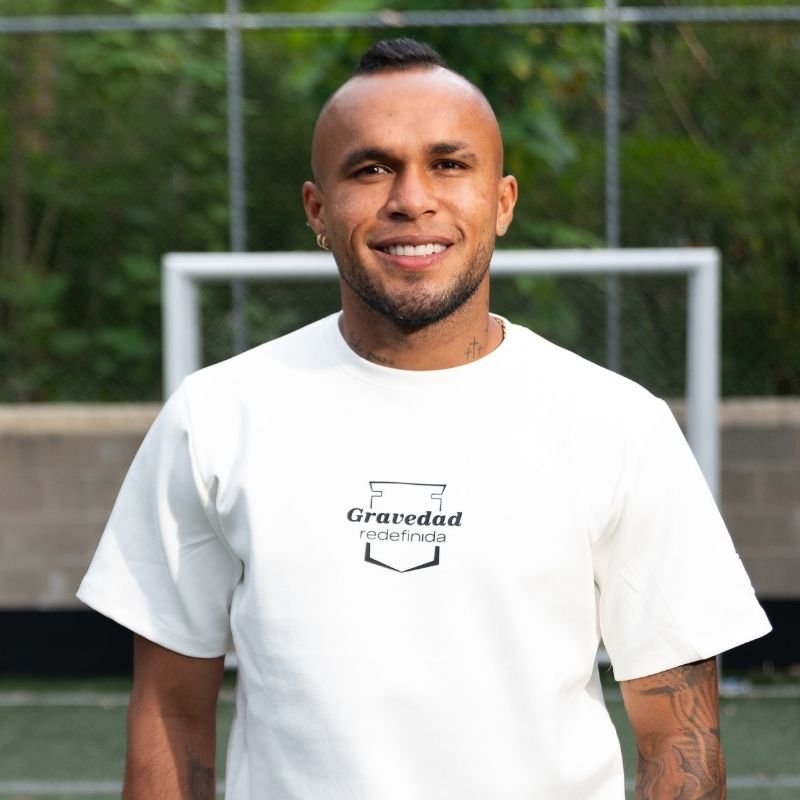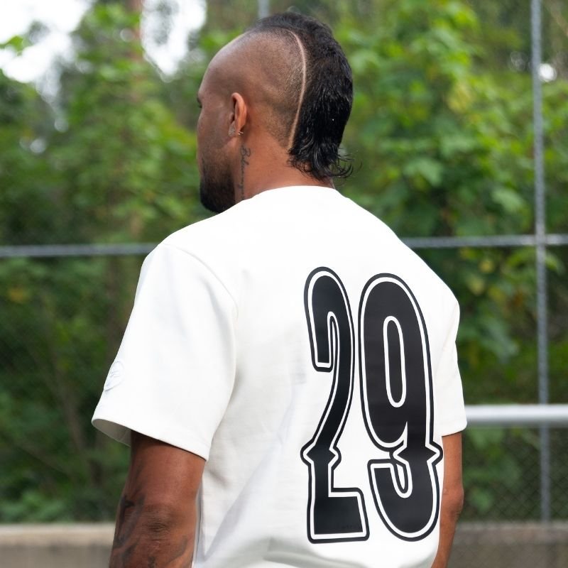 Camiseta oversize blanca gravedad 29 con diseño urbano y esencia futbolera. Una prenda inspirada en Andrés Sarmiento, ideal para destacar con estilo y comodidad.