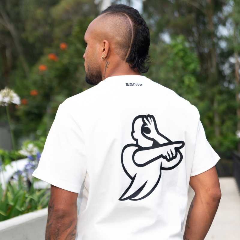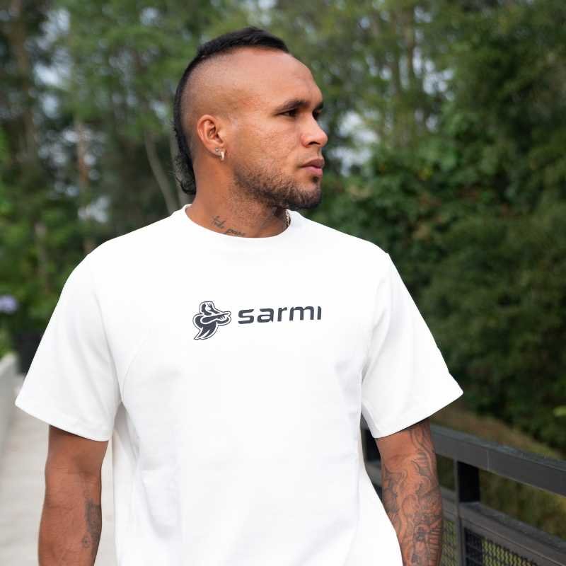 Camiseta oversize blanca sarmi con diseño urbano y esencia futbolera. Una prenda inspirada en Andrés Sarmiento, ideal para destacar con estilo y comodidad.