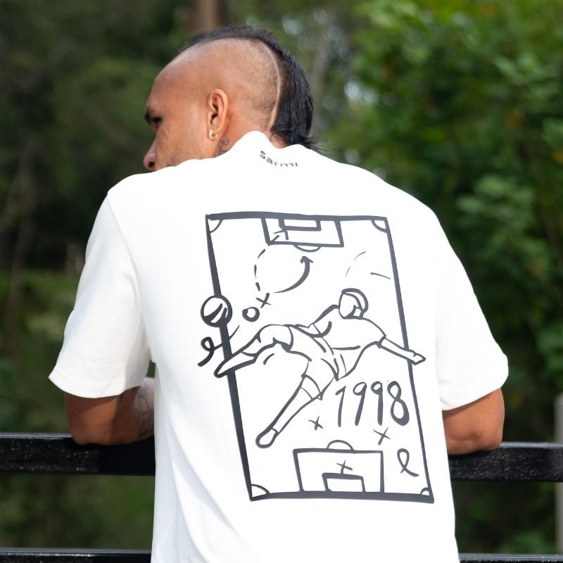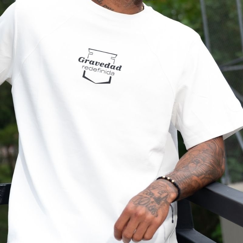Camiseta oversize gravedad blanca con diseño urbano y esencia futbolera. Una prenda inspirada en Andrés Sarmiento, ideal para destacar con estilo y comodidad.